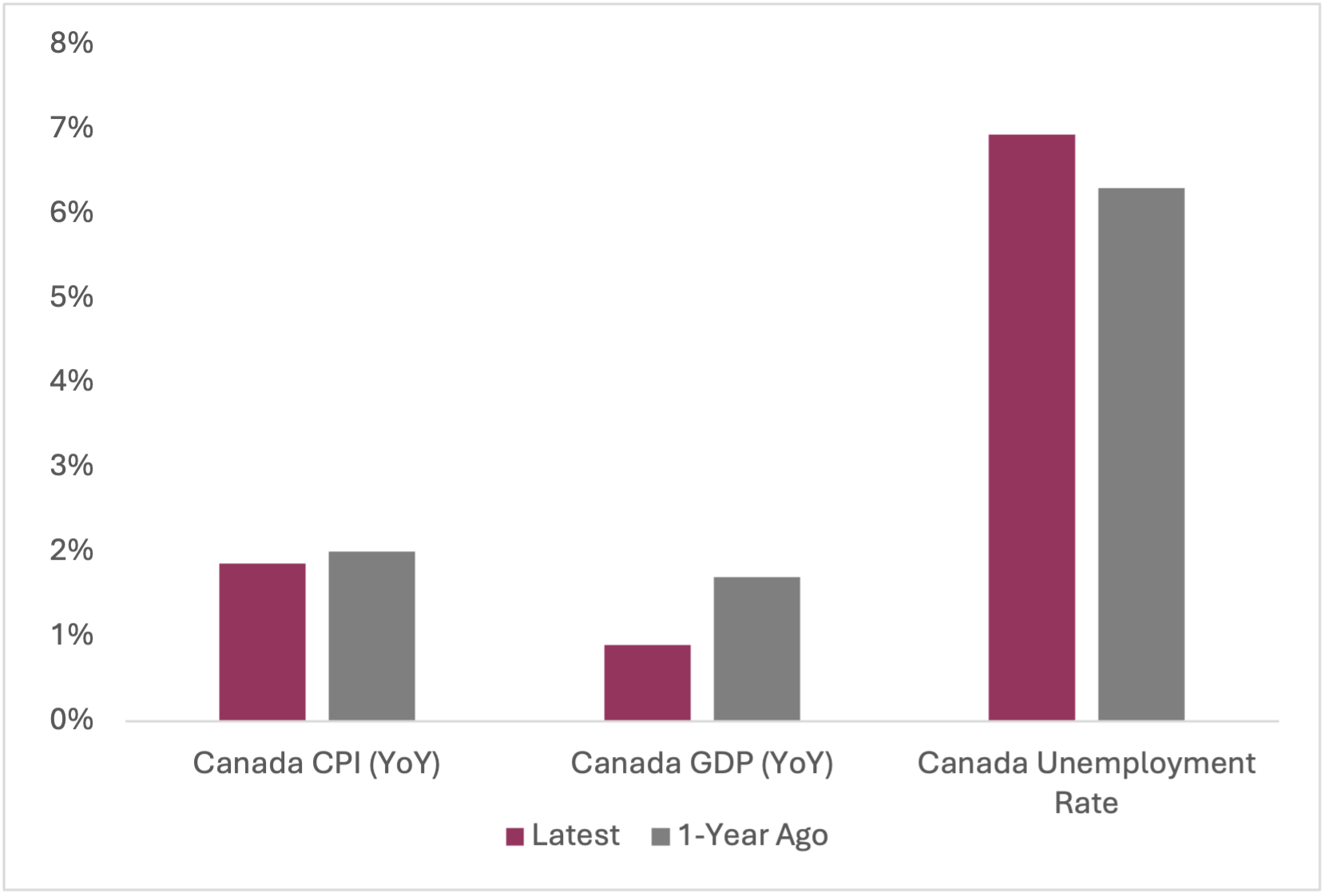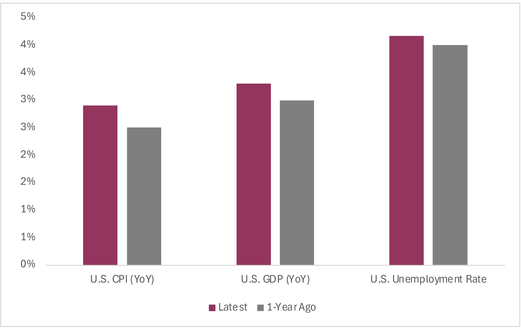 Source: Bloomberg, CPI data as of August 2025, GDP and Unemployment as of June 2025