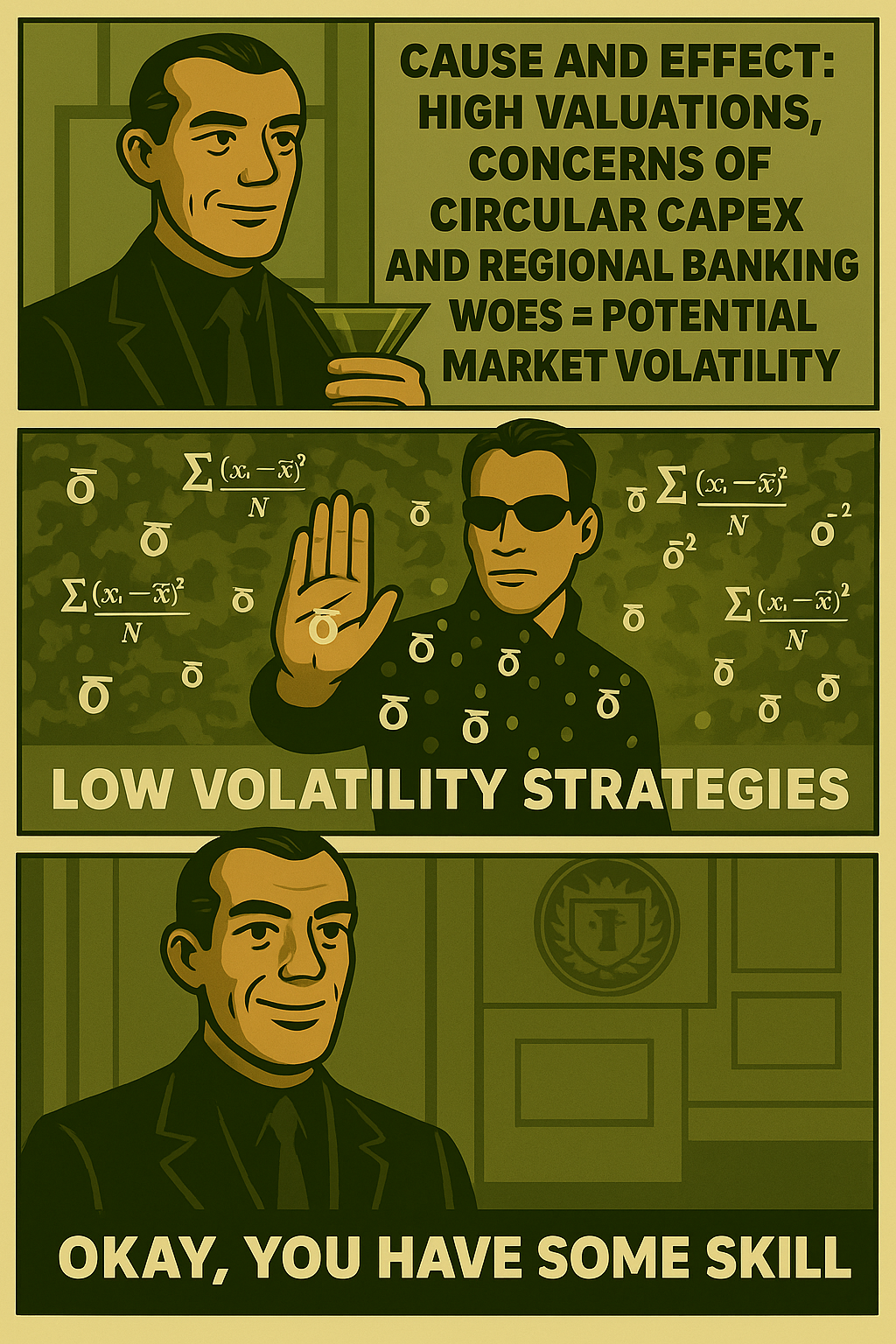 And with that, I’ll leave you with this fitting Matrix-inspired meme: the Merovingian, the “Trafficker of Information,” looking to disrupt the Oracle (the bull market), while Neo— Low Volatility Strategies—calmly counters within the Matrix. 😎😉