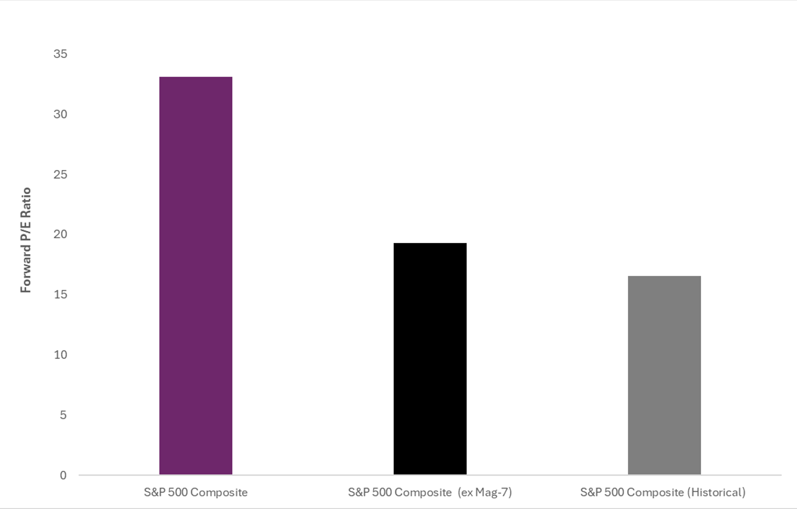 The Magnificent 7 continue to dominate market performance, representing an outsized share of the S&P 500’s total market capitalization and lifting aggregate valuations well above historical averages. Excluding these mega-cap names, the S&P 500 trades at a forward P/E of roughly 19.3x, only slightly above its long-term mean. Include them, and that multiple jumps to 33.1x.