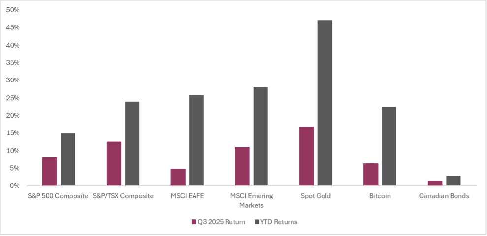 Source: Bloomberg, Q3 2025 are total returns between 06/30/2025 and 09/30/2025, YTD returns are between 12/31/2024 and 09/30/2025. All returns are expressed in USD except for S&P/TSX Composite and Canadian Bonds which are expressed in CAD.