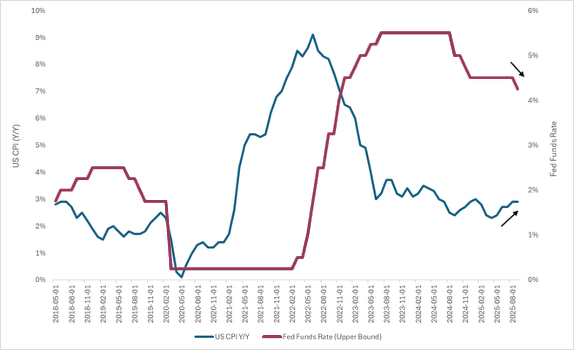 This move, however, appears inconsistent with his earlier position that the Fed cannot simultaneously stimulate the economy and fight inflation. The decision to cut while inflation is re-accelerating raises questions around policy credibility. U.S. year-over-year CPI has moved higher from 2.7% to 2.9%, brushing the upper end of the Fed’s target range, while the Fed’s preferred measure, core PCE, has also edged higher. Compounding the uncertainty, Powell refrained from offering clear forward guidance on the path ahead, while notably doing little to push back against market expectations for two additional cuts by year-end.