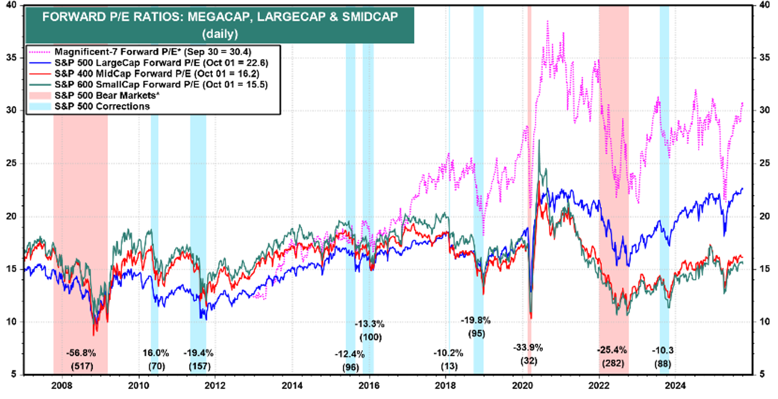 Concerns over market valuations have been a recurring theme, with headline measures such as the S&P 500 forward P/E suggesting that equities are trading above historical averages. While this surface-level view points to stretched valuations, much of the “froth” is concentrated in the Magnificent Seven stocks, which continue to command premium multiples. Outside of this narrow cohort, the broader market — particularly mid- and small-cap equities — appears far more reasonably priced.