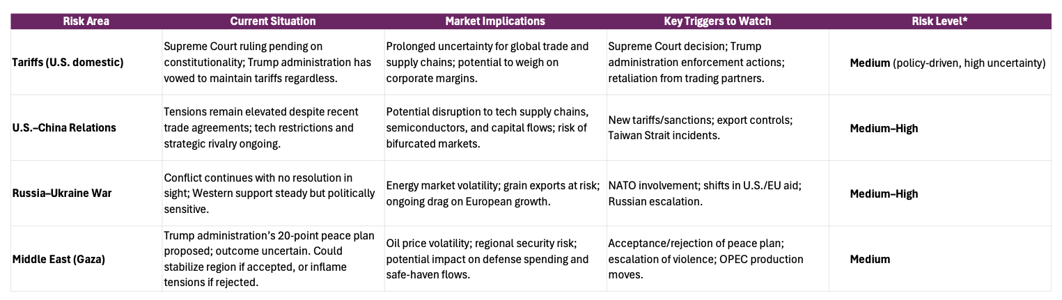 While markets have been dominated by monetary policy and earnings, geopolitics remains an important undercurrent that could reintroduce volatility. Trade tensions have eased somewhat as a number of countries struck tariff agreements with the U.S. during the quarter. However, uncertainty lingers as the Supreme Court weighs the constitutionality of tariffs. Importantly, the Trump administration has vowed to maintain tariffs regardless of the Court’s ruling, which could translate to ongoing uncertainty for global trade and supply chains. With the 2026 mid-term elections approaching, the administration will also be eager to secure policy “wins” to maintain and expand its congressional presence — adding another layer of political complexity to market dynamics.